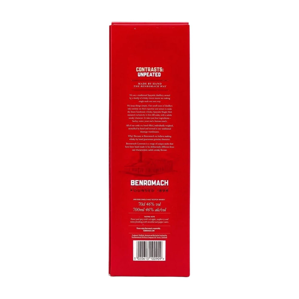 A Benromach lepárló Skócia híres Speyside régiójában található, ahol generációk óta a kézműves whiskygyártásra helyezik a hangsúlyt. A Contrasts sorozat a lepárló innovatív oldalát képviseli, miközben hű marad az autentikus, hagyományos eljárásokhoz. A Benromach Unpeated kiadás különlegessége, hogy teljes mértékben tőzegmentes, így a whisky tisztán a hordós érlelésből származó ízekre koncentrál.