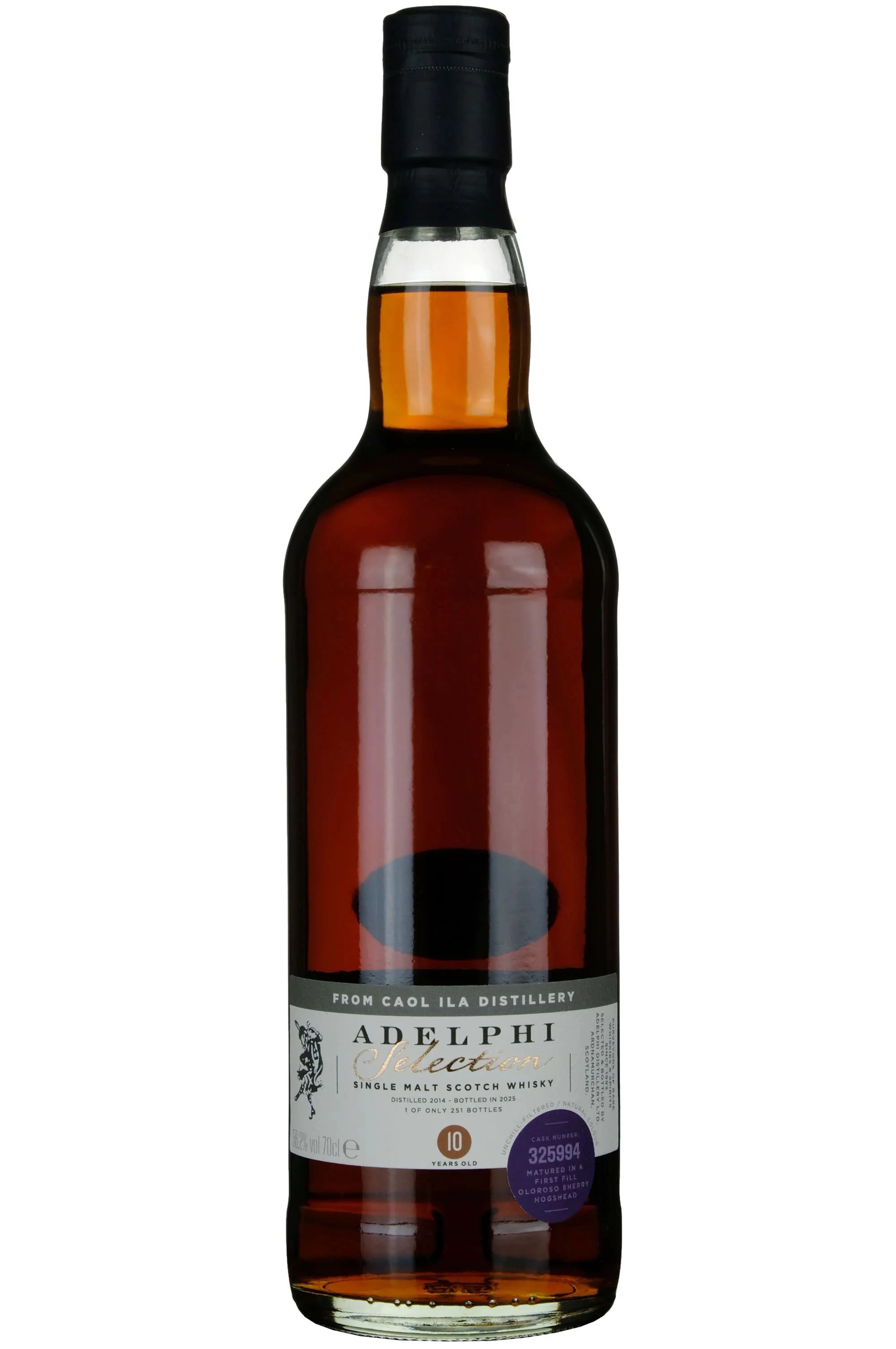 A Caol Ila Distillery az Islay sziget egyik ikonikus lepárlója, amely a tőzeges karakterek finomabb, elegánsabb oldalát mutatja. Ez a 2014-es, 10 éves kiadás 1st Fill Oloroso Hogsheadben érlelődött, az Adelphi független palackozó gondos válogatásában. Illatában tengerparti aromák, édes sherry, pörkölt mandula és narancsolaj érezhető. Ízében sós karamell, szárított gyümölcsök és tőzegfüst alkotnak mély egyensúlyt. Lecsengése hosszú, enyhén füstös, gazdag textúrával. Egy komplex, mégis kiegyensúlyozott Islay-malt, amely hűen képviseli a Caol Ila stílusát.