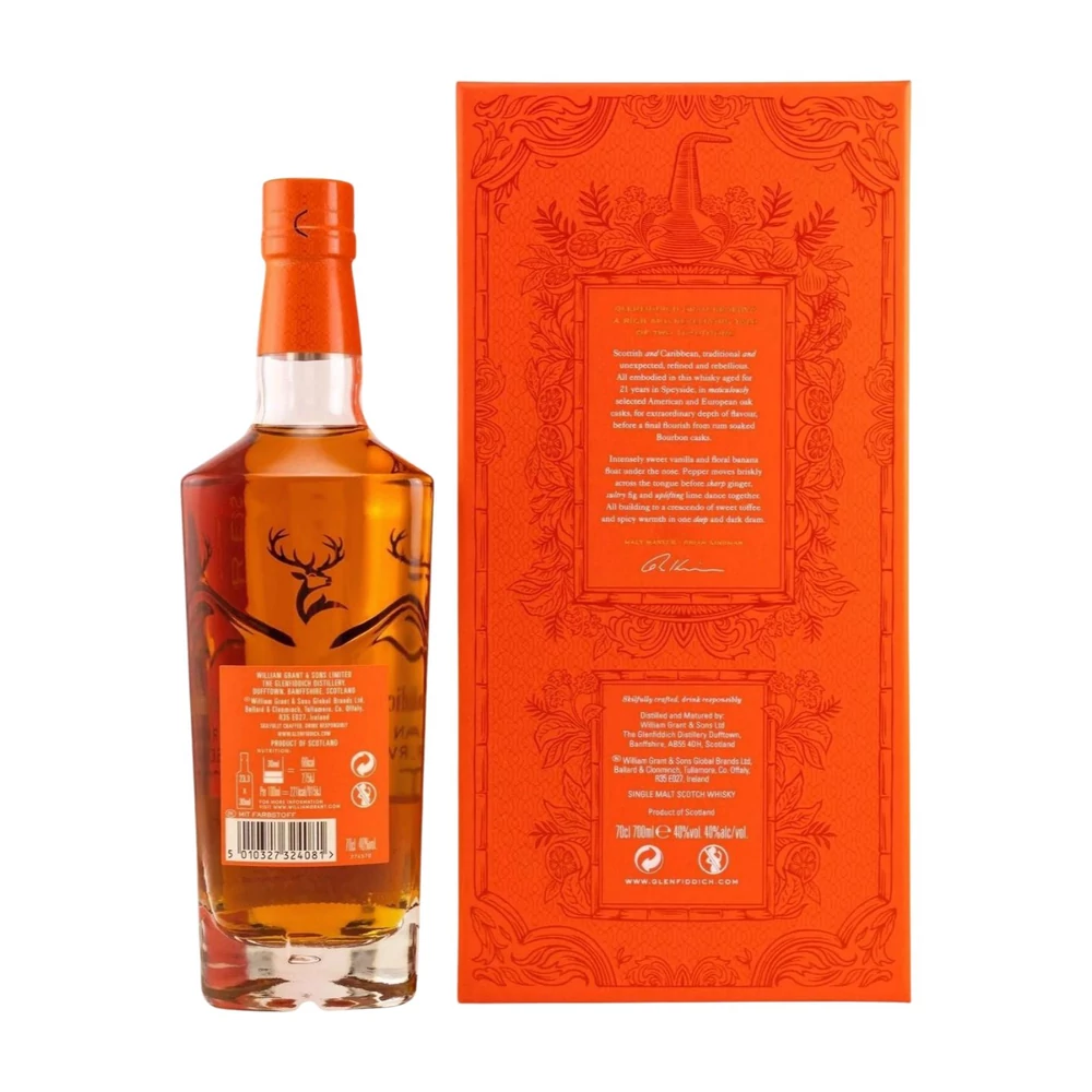A Glenfiddich 21 éves Gran Reserva a márka prémium vonalának egyik ékköve, amely a hagyományos skót érlelést karibi rumoshordós utóérleléssel koronázza meg. A whisky legalább 21 évet tölt amerikai tölgy- és sherryhordókban, mielőtt néhány hónapra karibi rumoshordókba kerül. Ennek köszönheti gazdag, mélyen gyümölcsös és fűszeres karakterét, amelyet egzotikus édesség és trópusi aromák egészítenek ki.