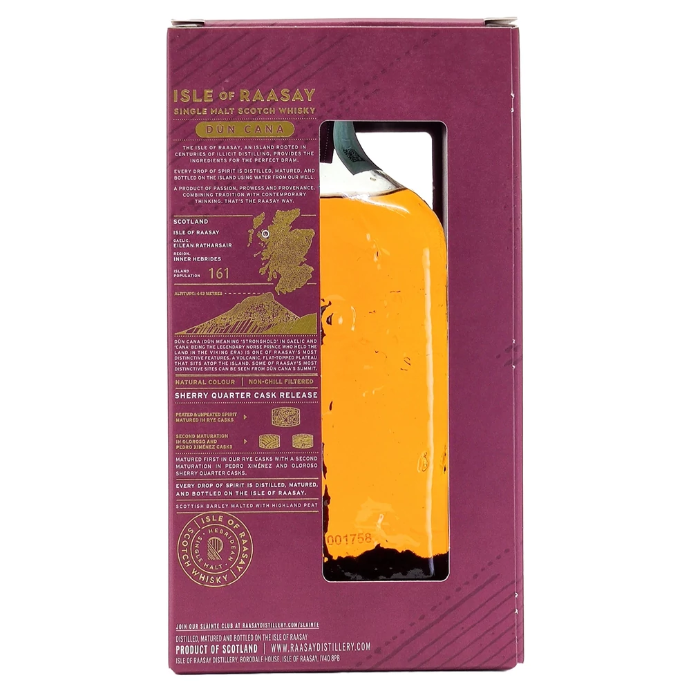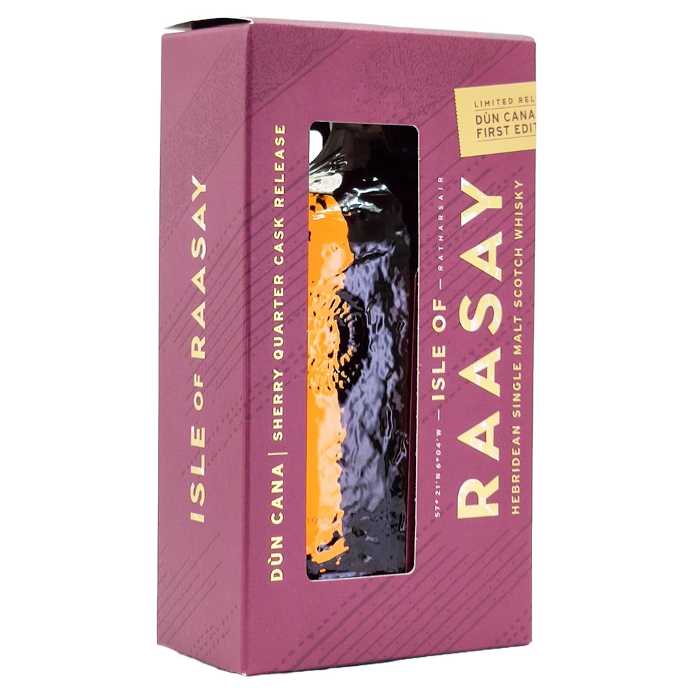 Az Isle of Raasay Dún Cana Rye & Sherry Double Cask Single Malt a skót Raasay sziget lepárlójának egyik legizgalmasabb, modern kiadása, amely a rozs- és sherryhordós érlelés egyedi kombinációját mutatja be. A tétel a lepárló kísérletező szellemiségét és a tengerparti éghajlat különleges hatását ötvözi, így egyszerre testes, fűszeres és gyümölcsös karakterű whisky született.