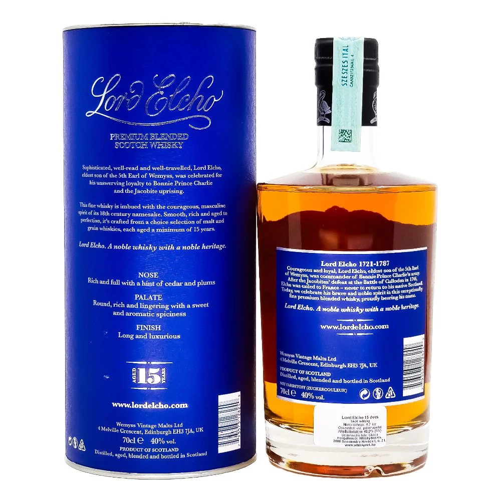 A Lord Elcho 15 éves a blended whiskyk csúcsát jelenti, hisz szigorúan válogatott hordós érlelésekből - minimum 15 éves párlatokból- keverik ki, és legalább 40%-nyi malátawhiskyt tartalmaz. Egészen sima, gazdag, melengetően fűszeres, édes aromavilágú whisky, jelentős sherrys befolyással.