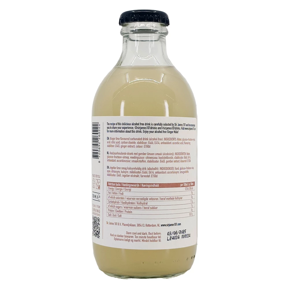 A Sir James 101 Ginger Mule egy prémium minőségű, alkoholmentes koktél, amely a híres Moscow Mule frissítő, fűszeres ízvilágát hozza el azok számára, akik az alkoholmentességet részesítik előnyben.