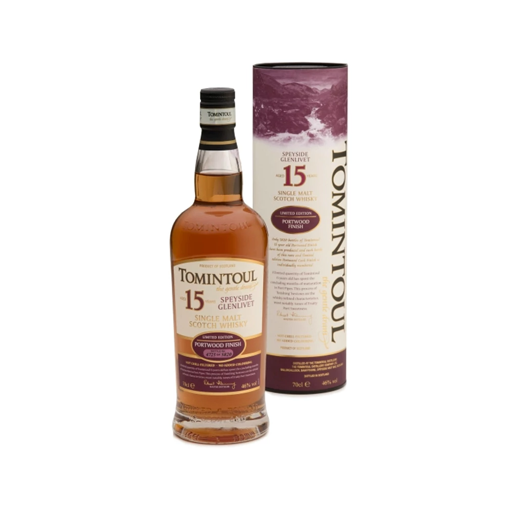 Tomintoul 15 éves Portwood Finish a Speyside-régió egyik leglágyabb és legkiegyensúlyozottabb whiskyje, amely a klasszikus házstílust gazdagítja a portói hordós utóérlelés különleges mélységével.